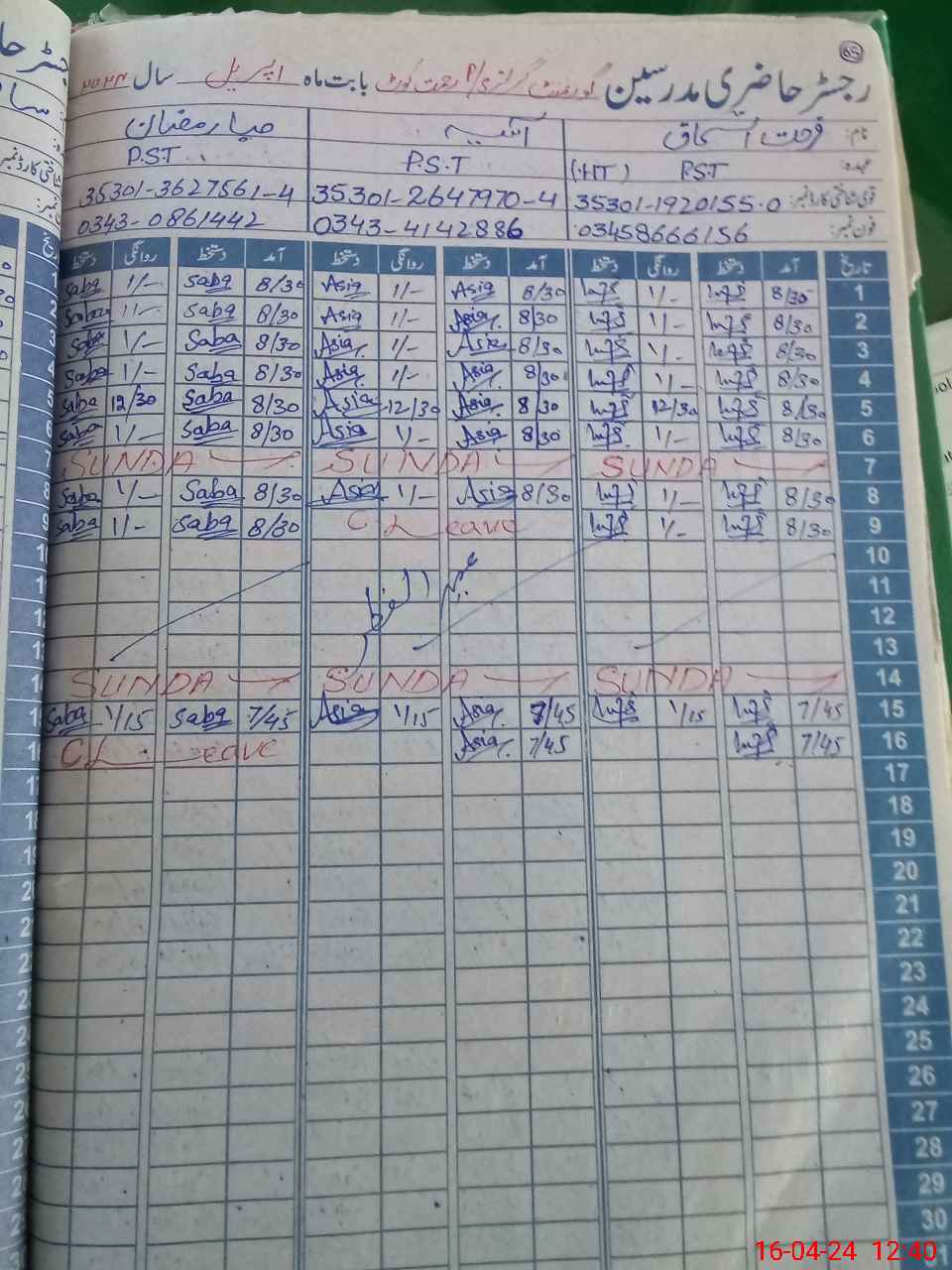 | CNIC | Full Name | Designation | R/C | Absence During Last Calender Month |