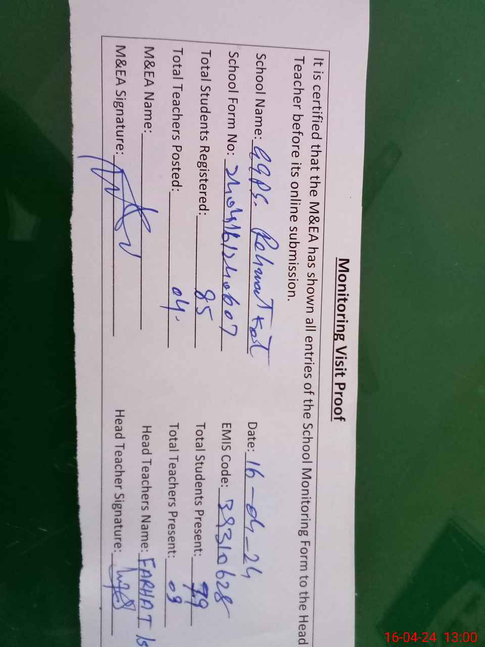 | Attendance Register | Head Teacher | MEA with School | Visit Proof |