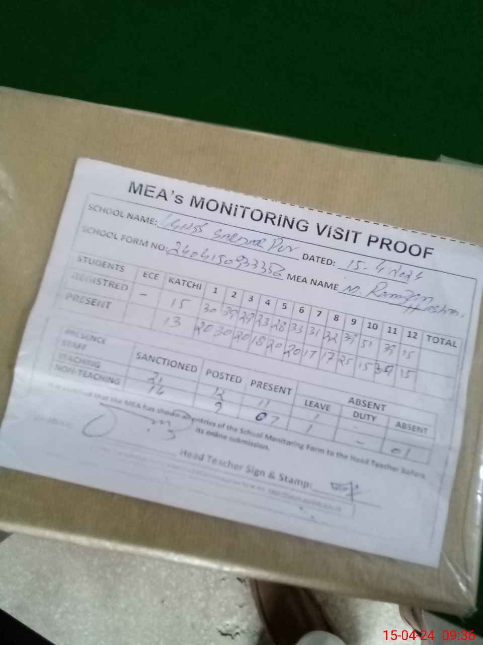| Attendance Register | Head Teacher | MEA with School | Visit Proof |