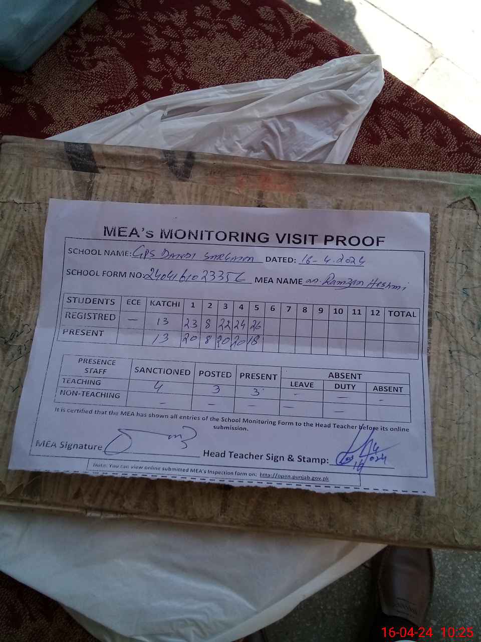 | Attendance Register | Head Teacher | MEA with School | Visit Proof |