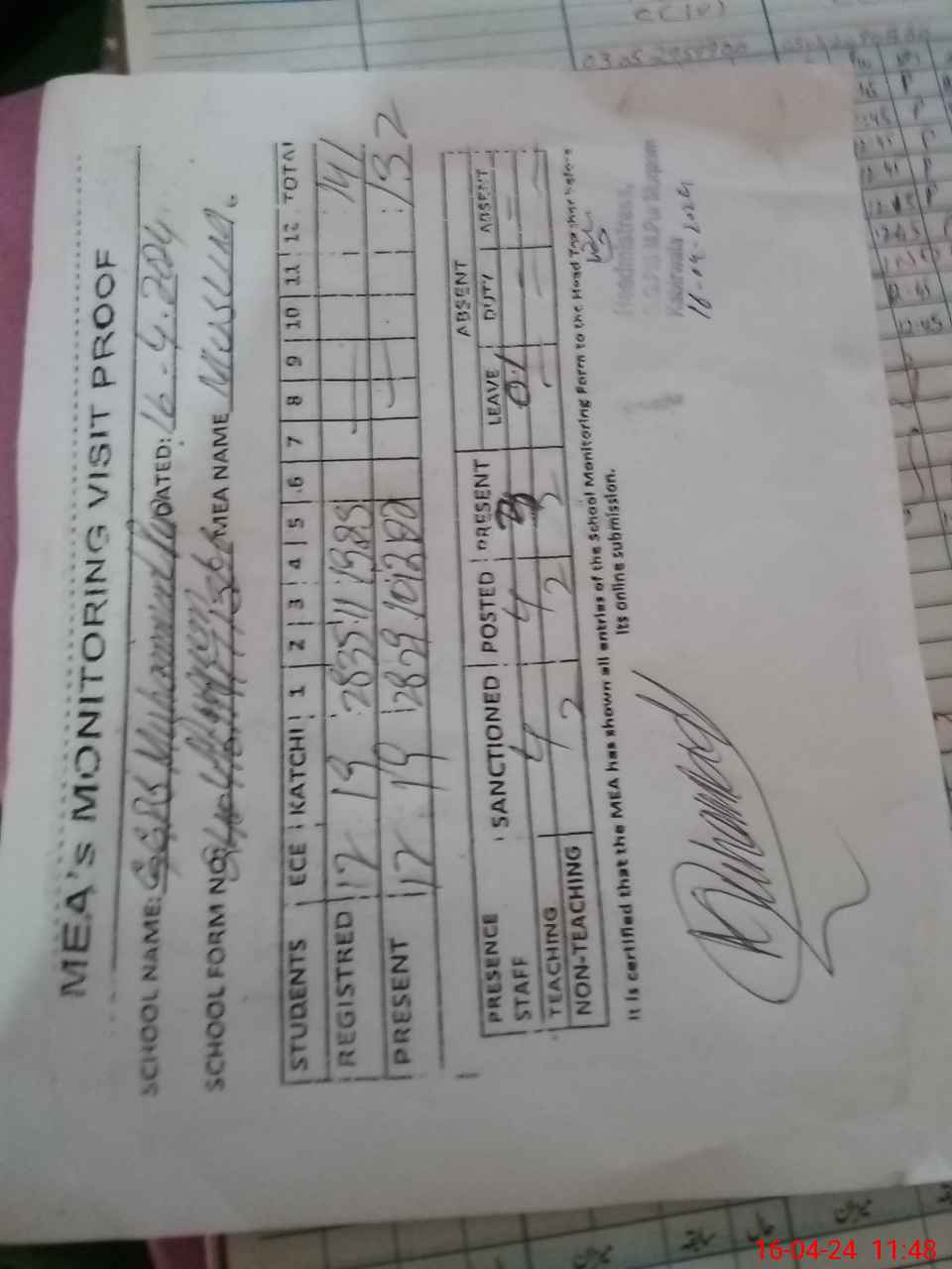 | Attendance Register | Head Teacher | MEA with School | Visit Proof |