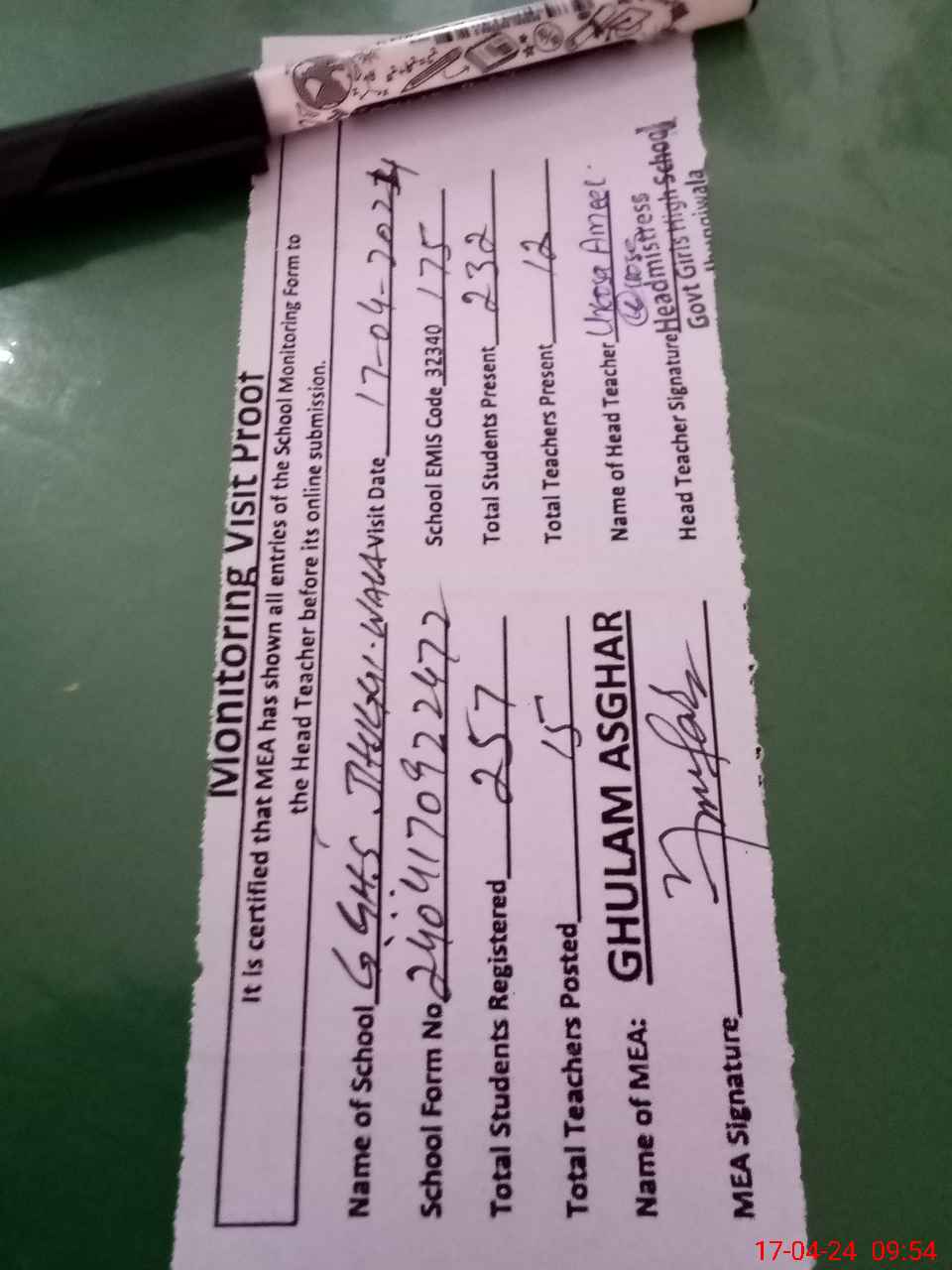 | Attendance Register | Head Teacher | MEA with School | Visit Proof |