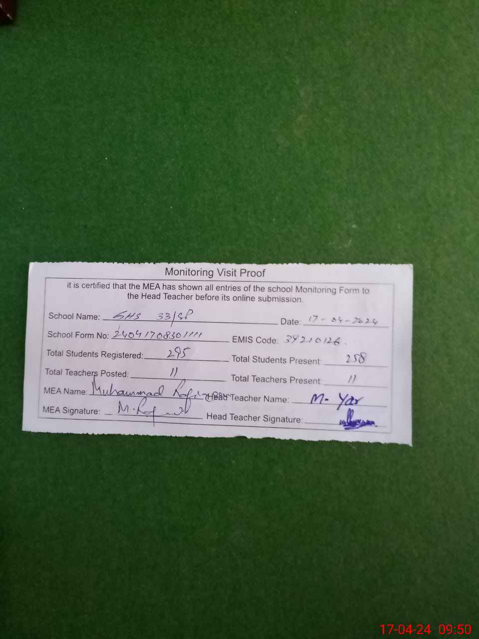 | EMIS Code: 39210126 | Name of School: GHS 33 SP | |||