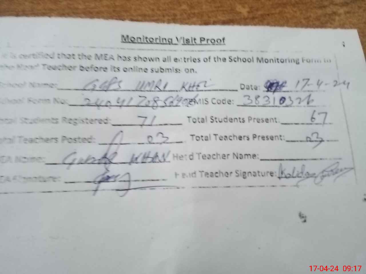 | Attendance Register | Head Teacher | MEA with School | Visit Proof |