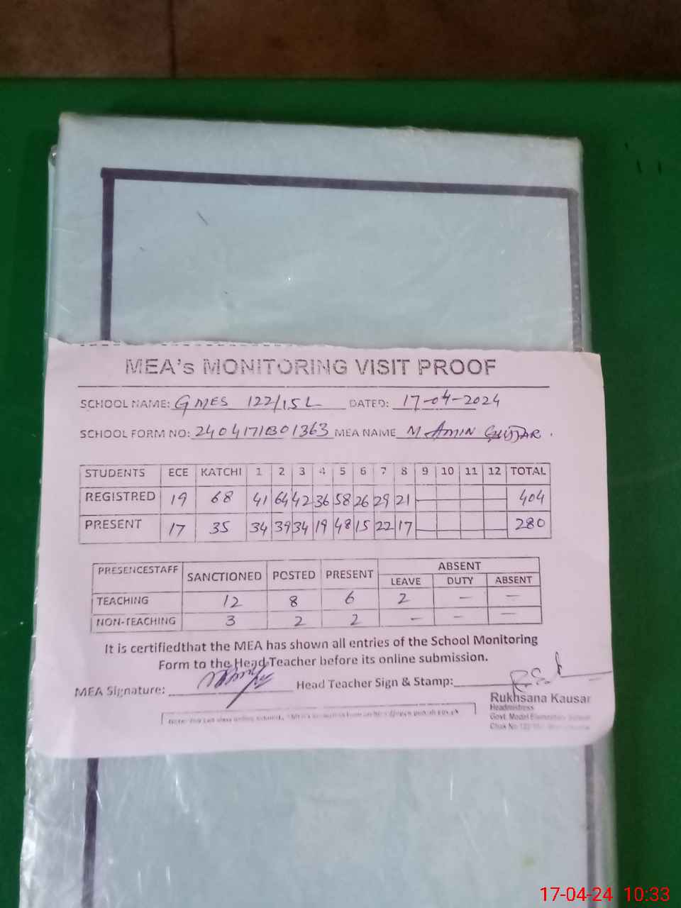 | Attendance Register | Head Teacher | MEA with School | Visit Proof |