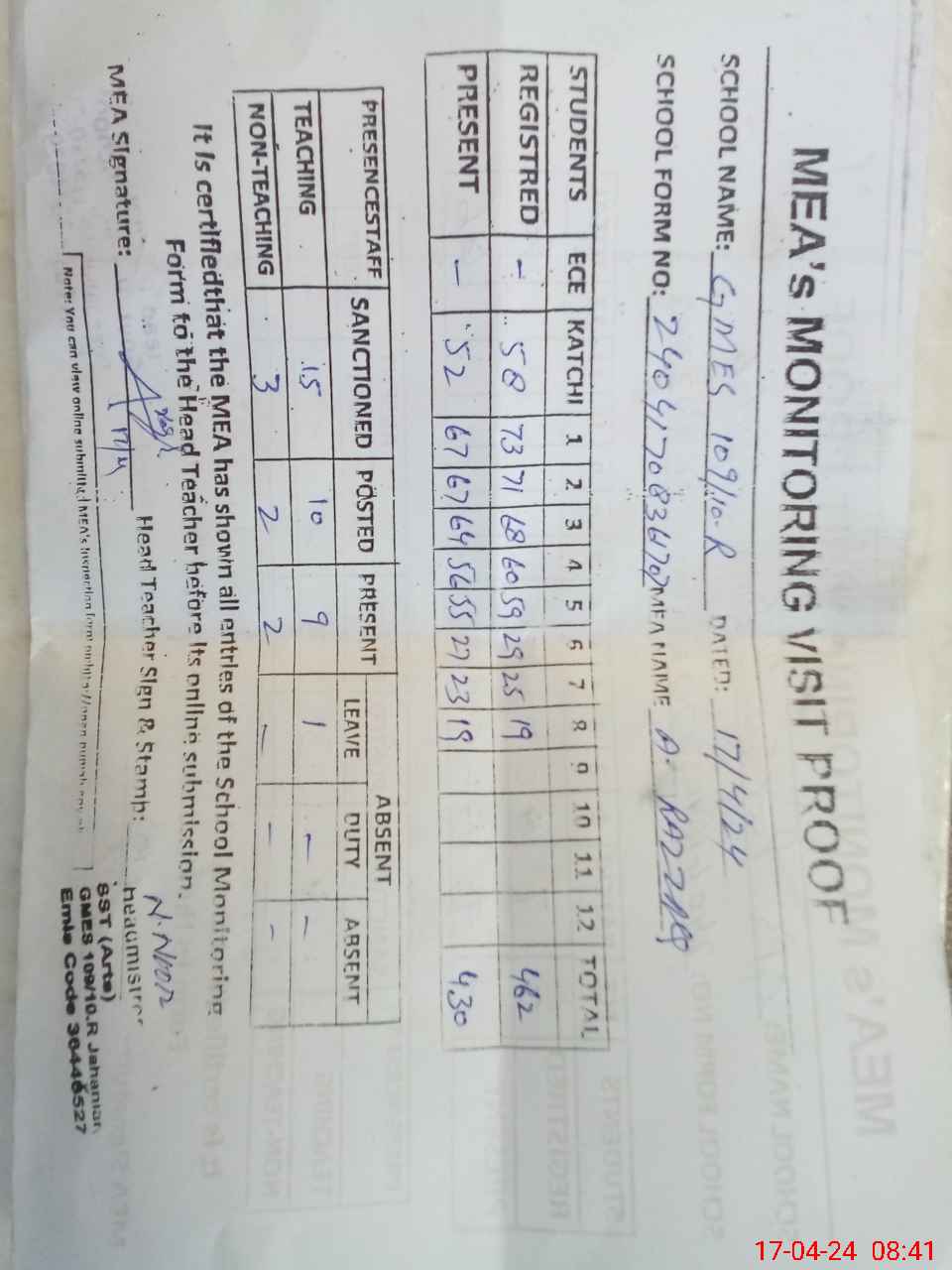 | Attendance Register | Head Teacher | MEA with School | Visit Proof |
