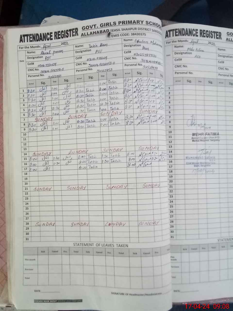 | Name: AK**** PA**** Designation: (School Headmaster's/Headmistress's) PST Phone/Cell Number: 03**** |