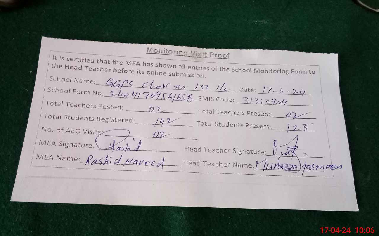 | EMIS Code: 31310904 | Name of School: GGPS CHAK NO.133/L | |||