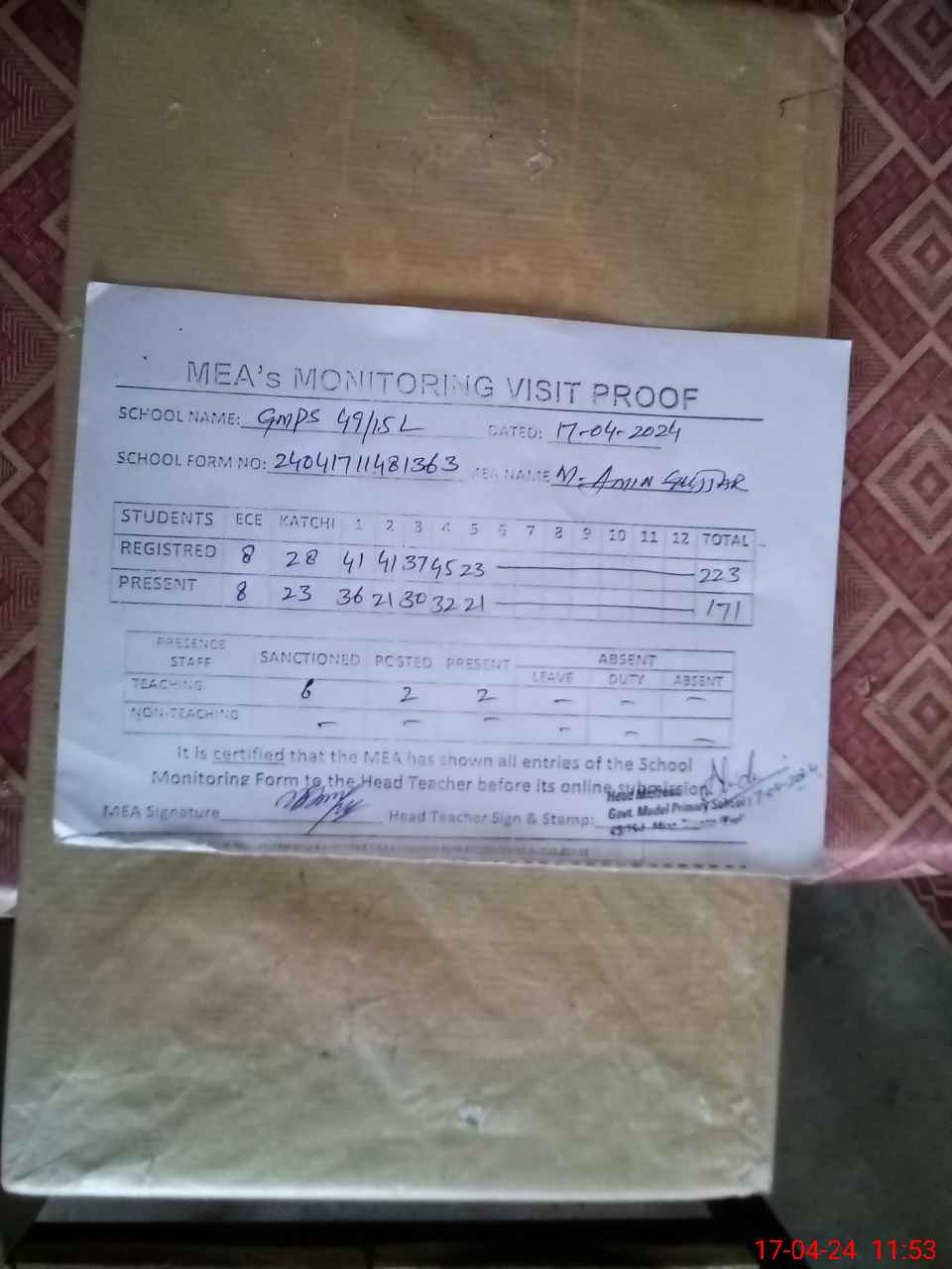 | Attendance Register | Head Teacher | MEA with School | Visit Proof |