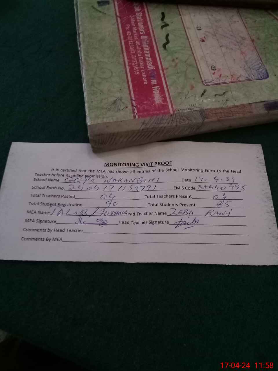 | Attendance Register | Head Teacher | MEA with School | Visit Proof |