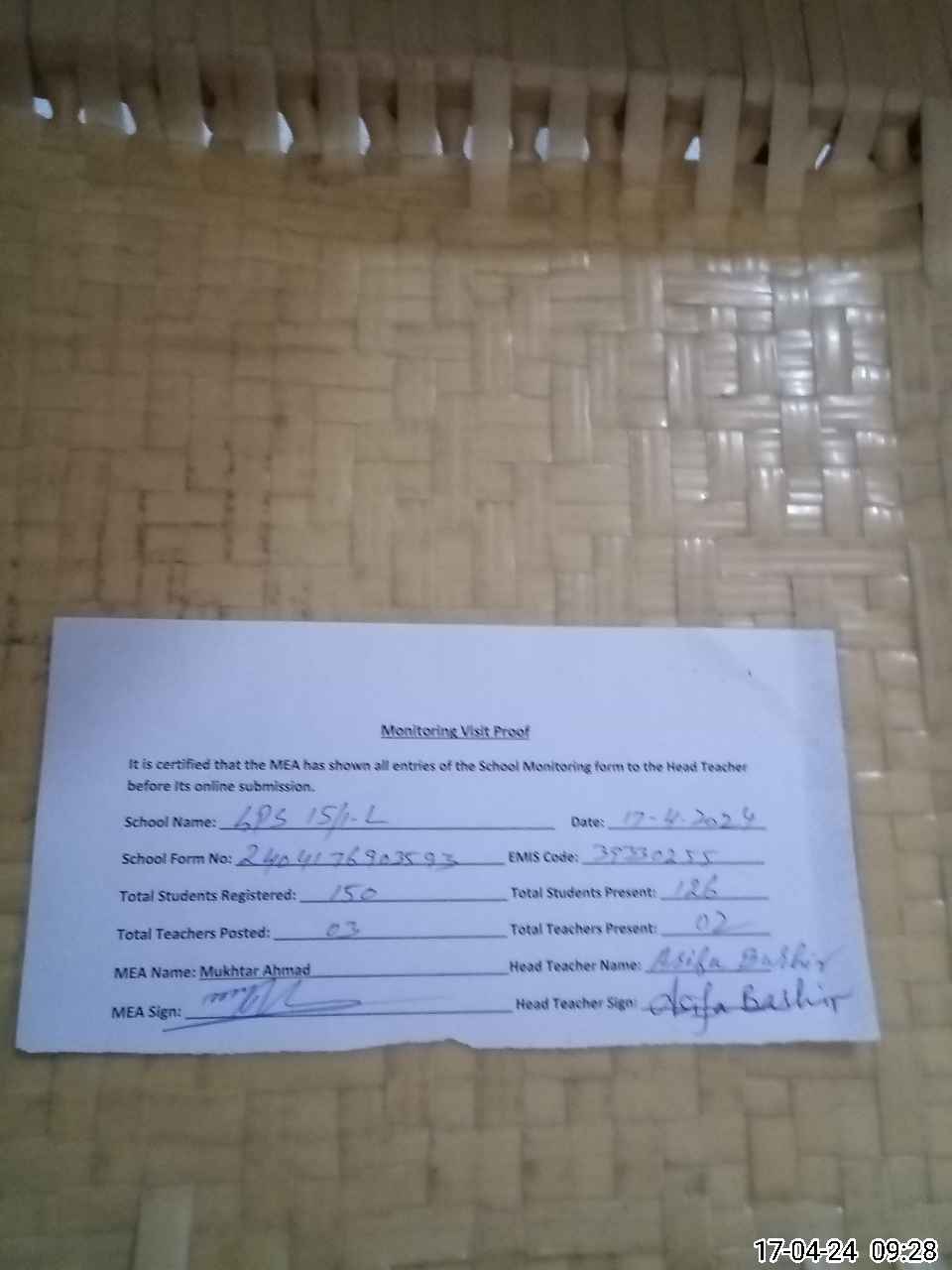 | Attendance Register | Head Teacher | MEA with School | Visit Proof |