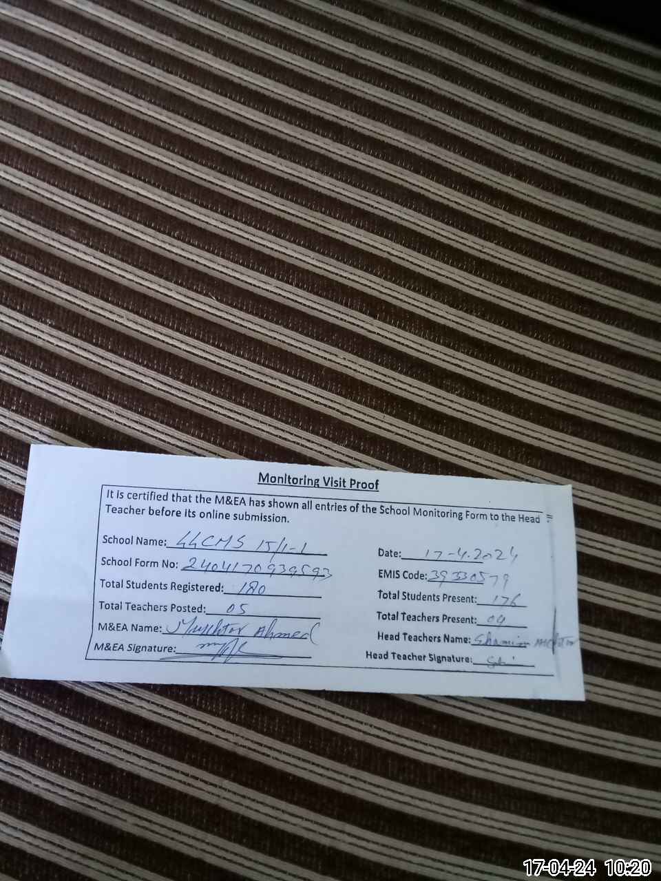 | Attendance Register | Head Teacher | MEA with School | Visit Proof |