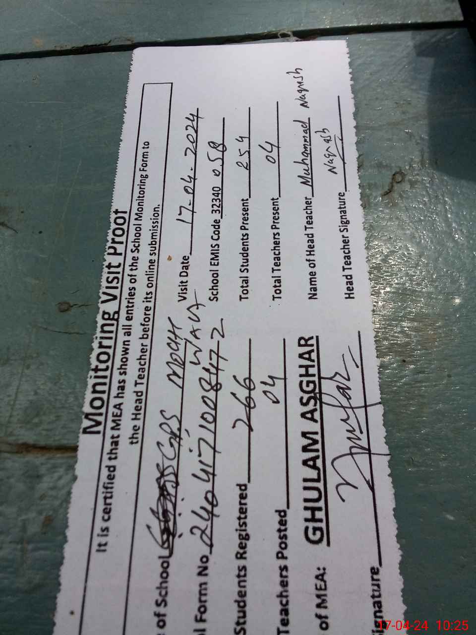 | Attendance Register | Head Teacher | MEA with School | Visit Proof |
