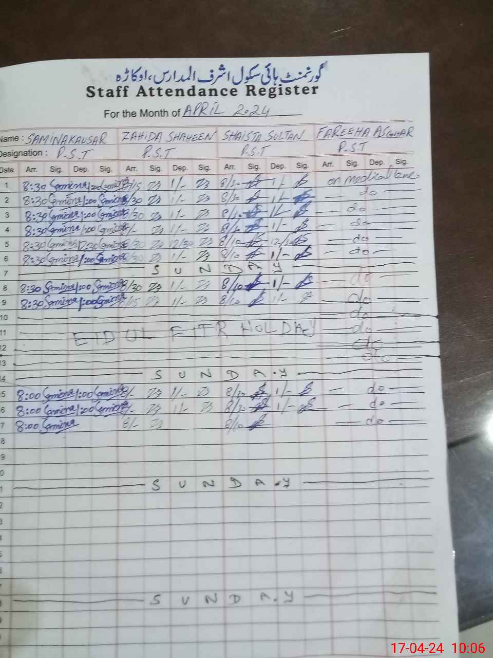 | CNIC | Full Name | Designation | R/C | Absence During Last Calender Month |