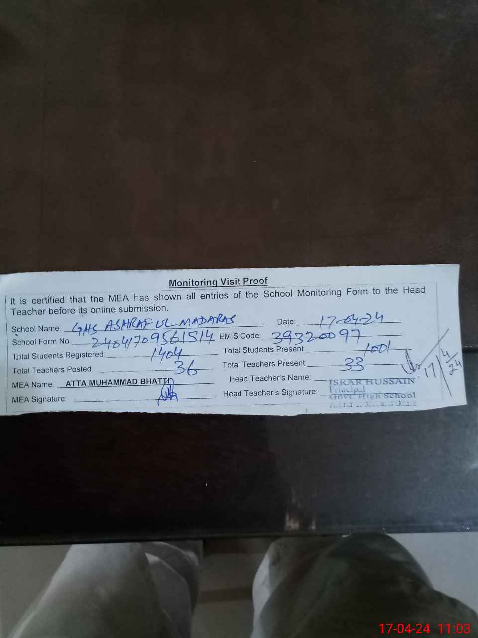 | Attendance Register | Head Teacher | MEA with School | Visit Proof |