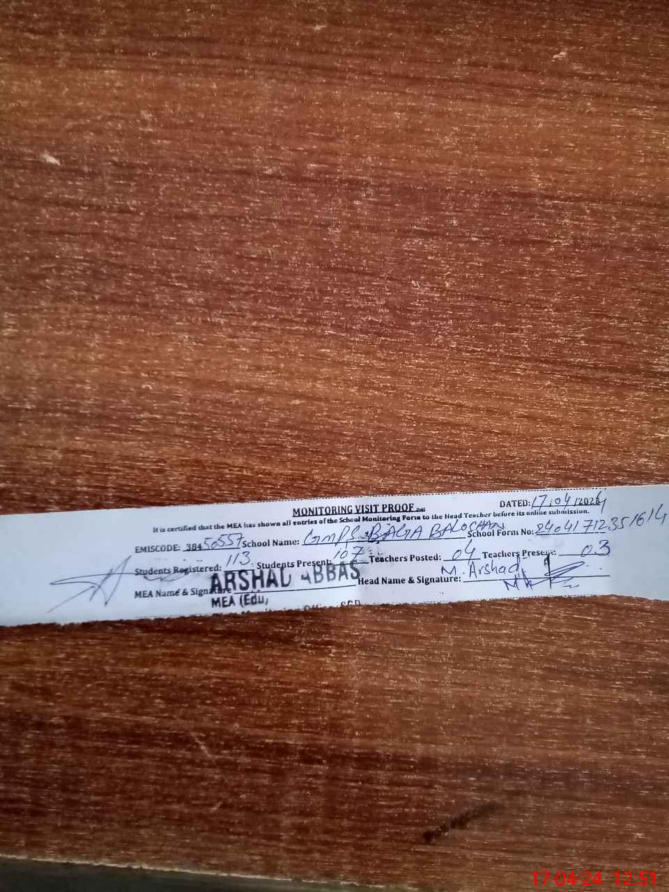 | Attendance Register | Head Teacher | MEA with School | Visit Proof |