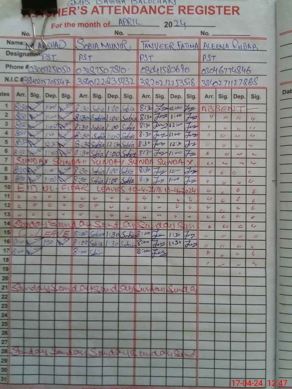 | CNIC | Full Name | Designation | R/C | Absence During Last Calender Month |