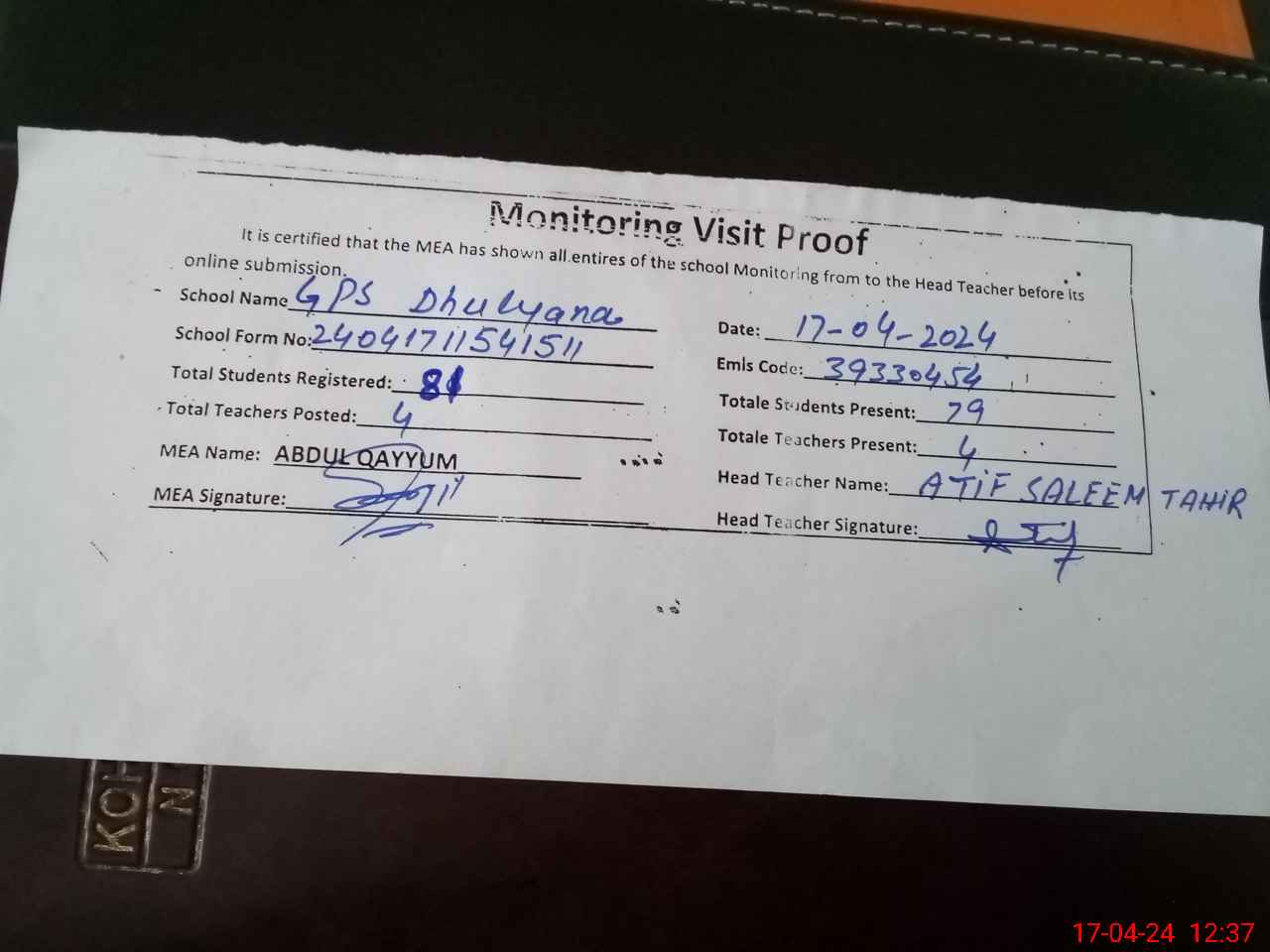 | Attendance Register | Head Teacher | MEA with School | Visit Proof |