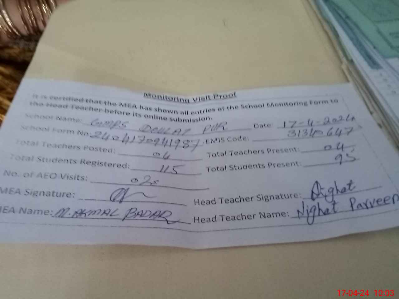 | Attendance Register | Head Teacher | MEA with School | Visit Proof |