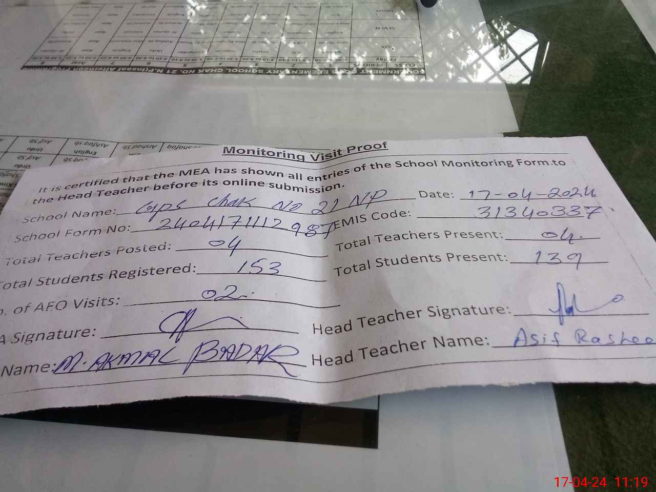 | Attendance Register | Head Teacher | MEA with School | Visit Proof |