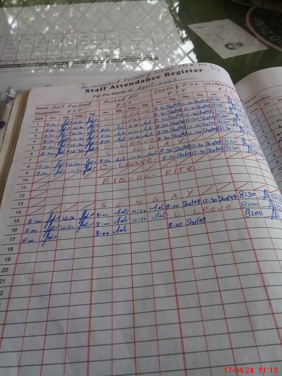 | CNIC | Full Name | Designation | R/C | Absence During Last Calender Month |
