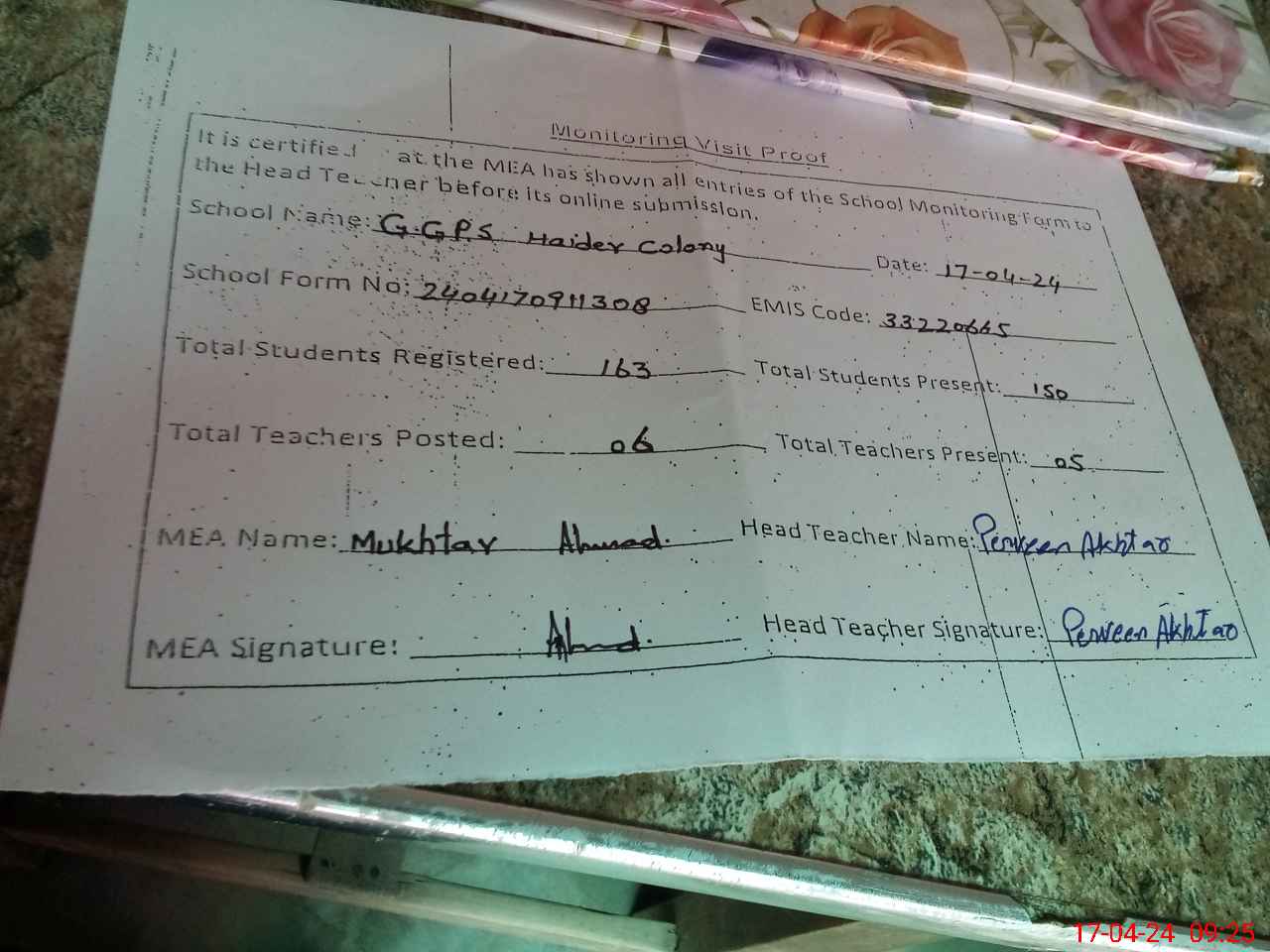 | Attendance Register | Head Teacher | MEA with School | Visit Proof |