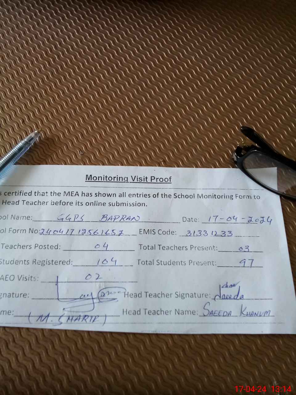 | Attendance Register | Head Teacher | MEA with School | Visit Proof |
