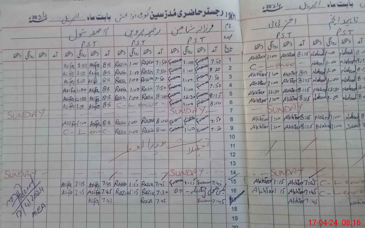 | CNIC | Full Name | Designation | R/C | Absence During Last Calender Month |