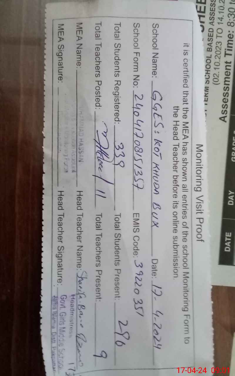 | EMIS Code: 39220351 | Name of School: GGES KOT KHUDA BUKSH | |||