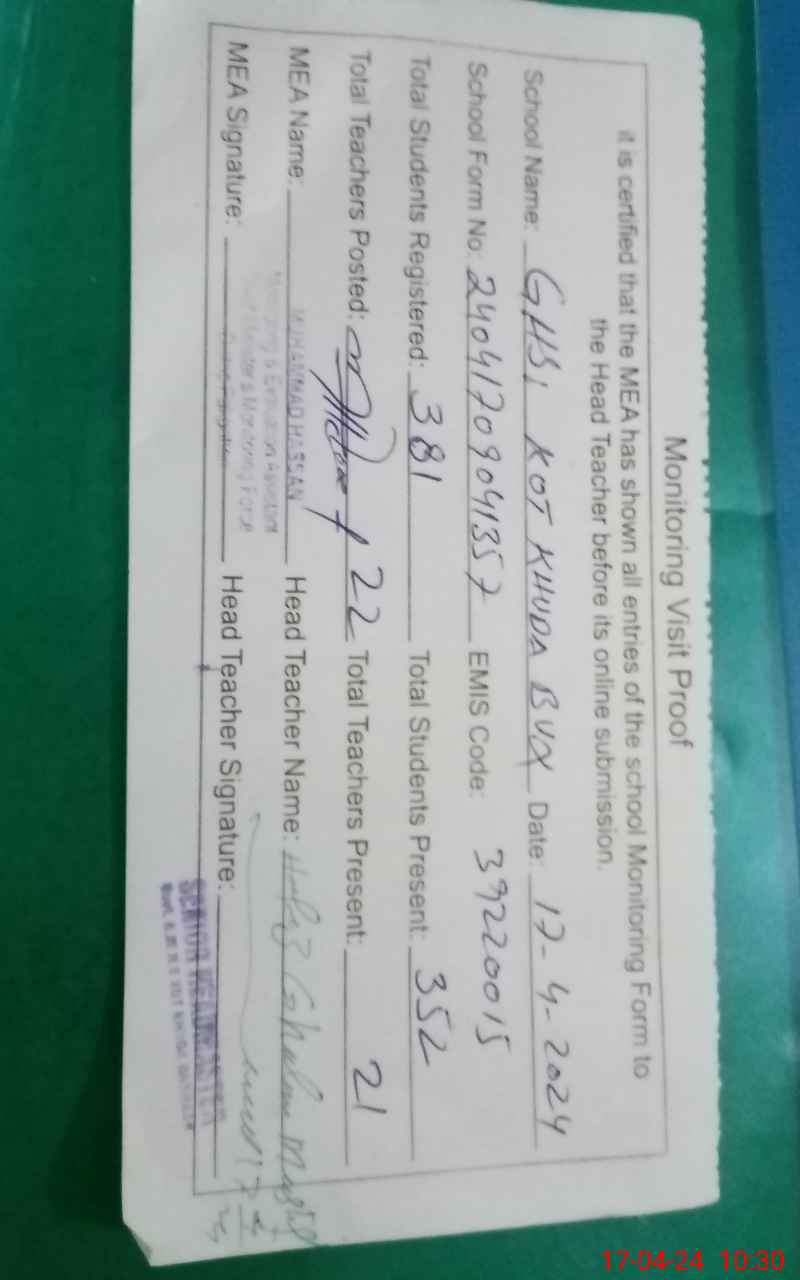 | EMIS Code: 39220015 | Name of School: GHS ARABIC MODEL KOT KHUDA BAKHSH | |||