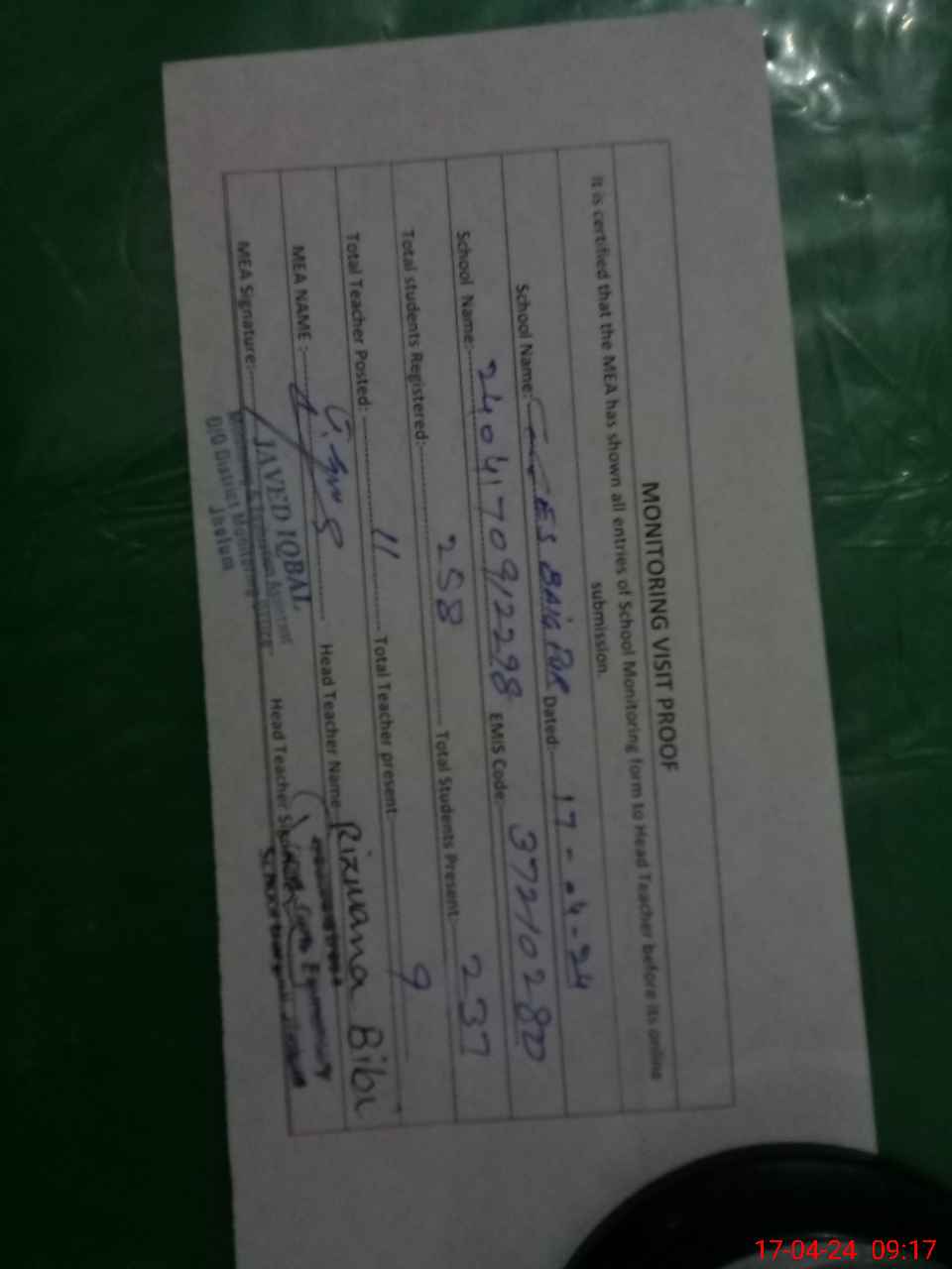 | Attendance Register | Head Teacher | MEA with School | Visit Proof |