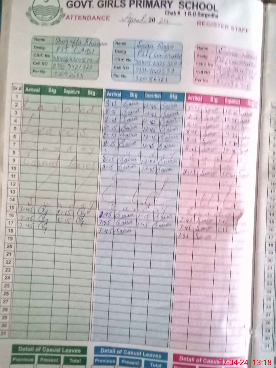 | CNIC | Full Name | Designation | R/C | Absence During Last Calender Month |