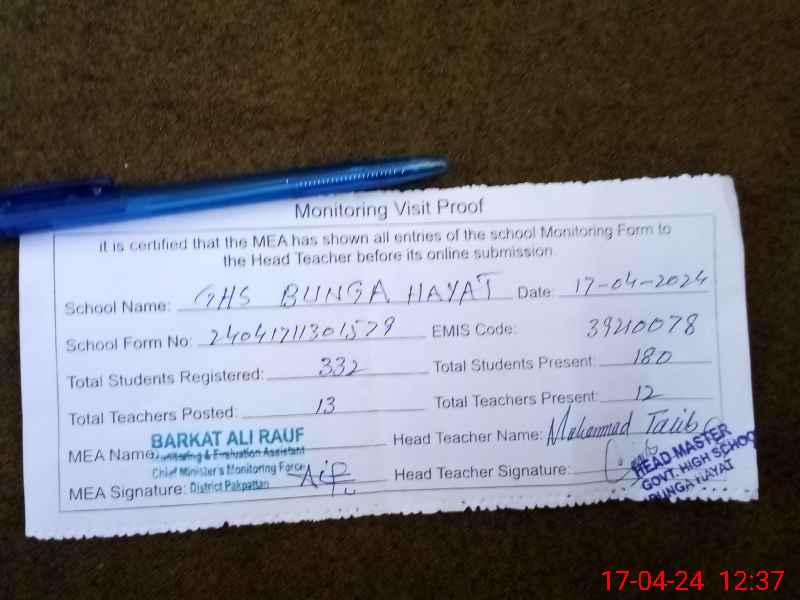 | EMIS Code: 39210078 | Name of School: GHS BUNGA HAYAT | |||