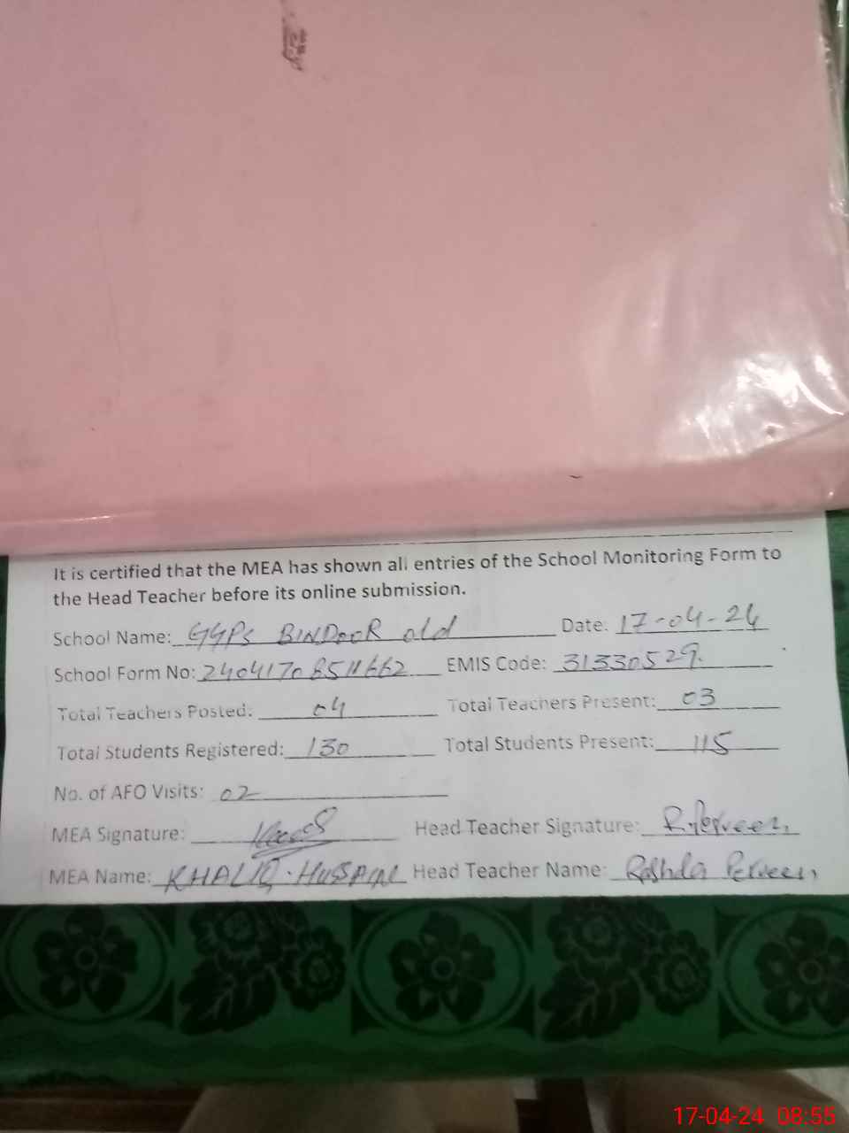 | Certified that this School was Inspected by the Undersigned MEA/DMO Today and the Information Stated Above is as Per Record. | |||||