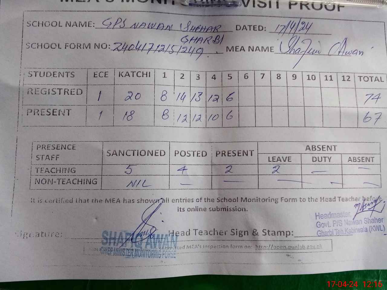 | EMIS Code: 36410515 | Name of School: GPS NAWAN SHEHR GHARBI, KABIRWALA | |||
