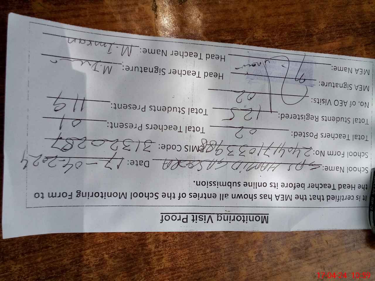 | Attendance Register | Head Teacher | MEA with School | Visit Proof |