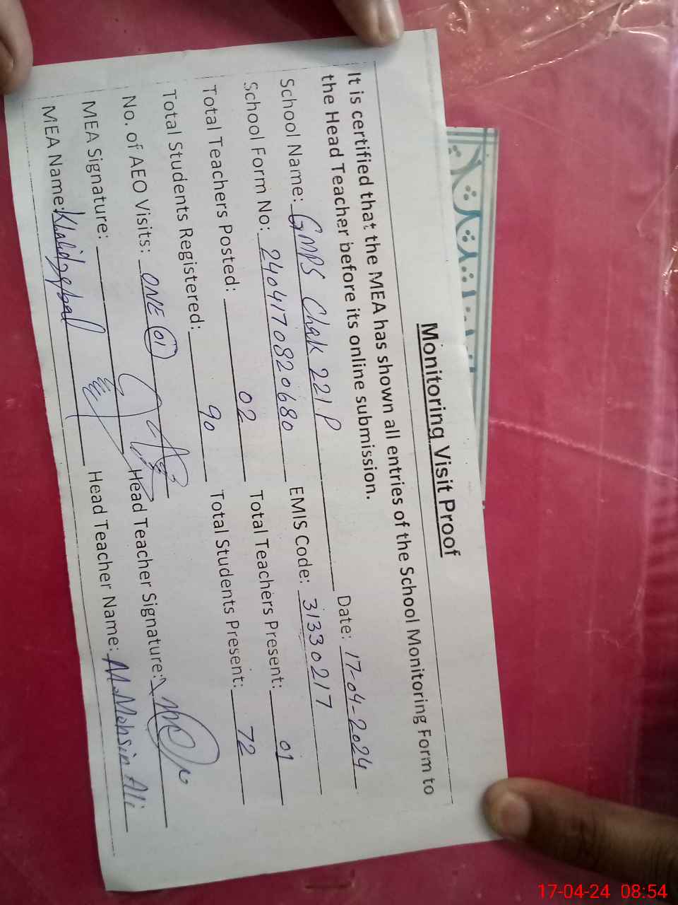 | EMIS Code: 31330217 | Name of School: GMPS CHAK NO. 221/P | |||