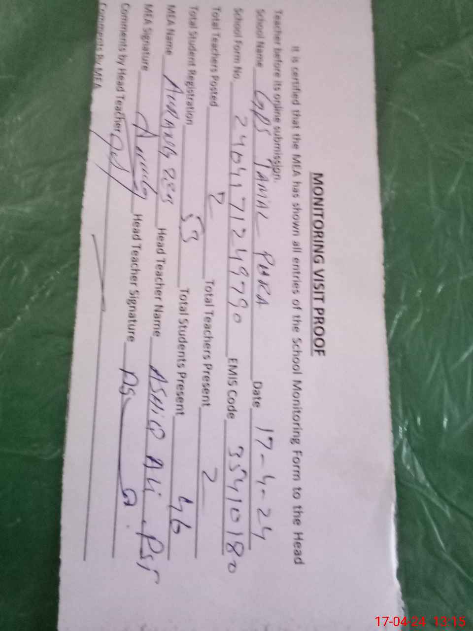 | Attendance Register | Head Teacher | MEA with School | Visit Proof |
