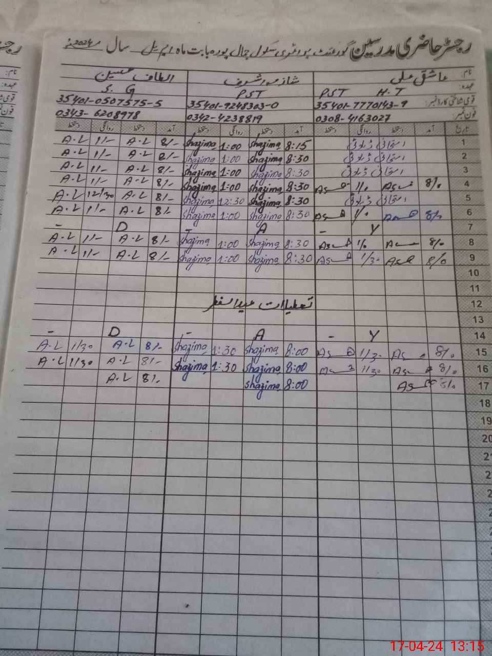| Name: AS**** AL**** Designation: (School Headmaster's/Headmistress's) PST Phone/Cell Number: 03**** |
