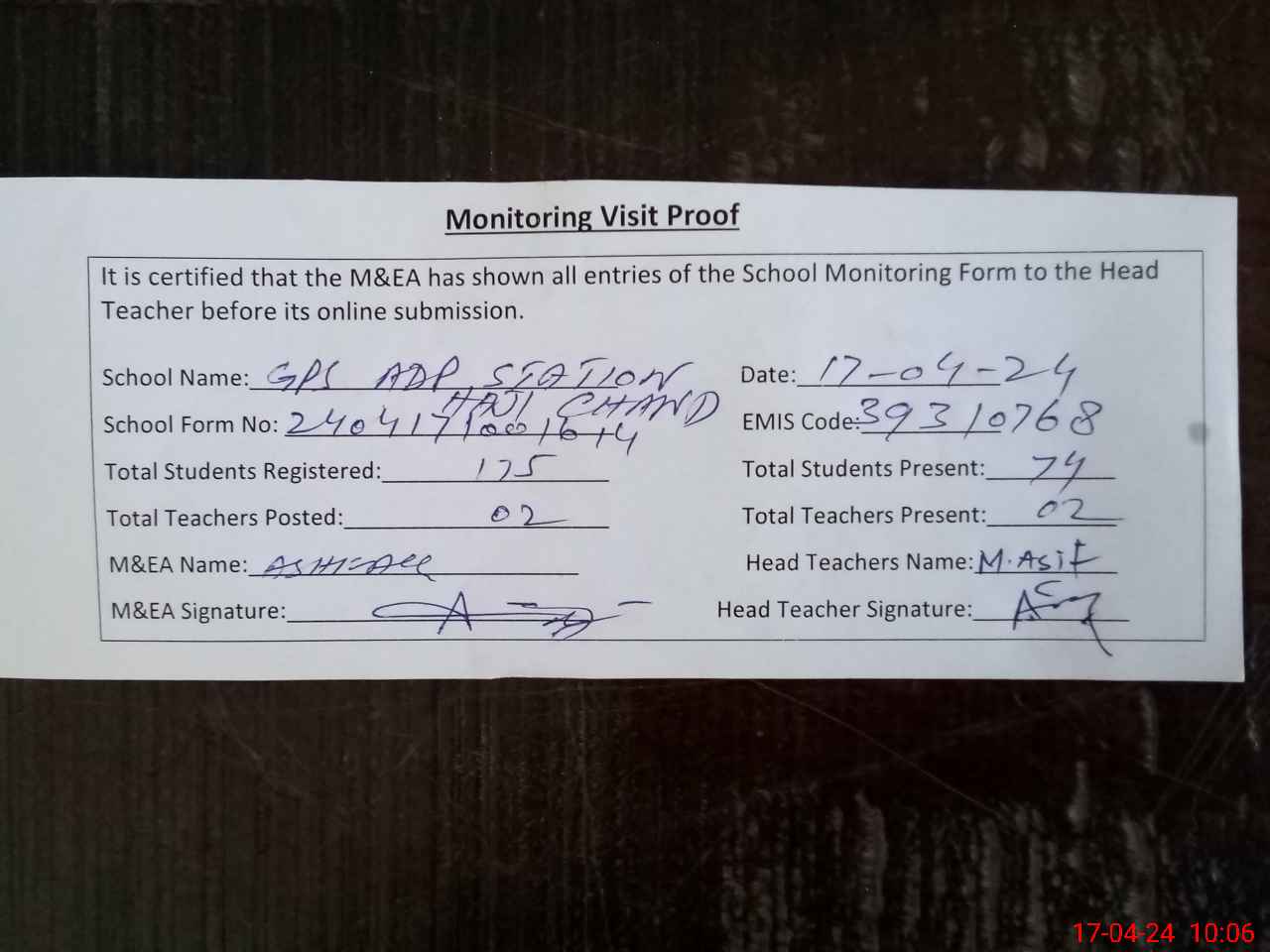 | Attendance Register | Head Teacher | MEA with School | Visit Proof |