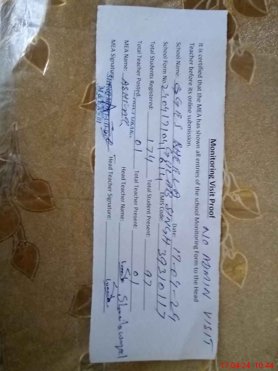 | Attendance Register | Head Teacher | MEA with School | Visit Proof |
