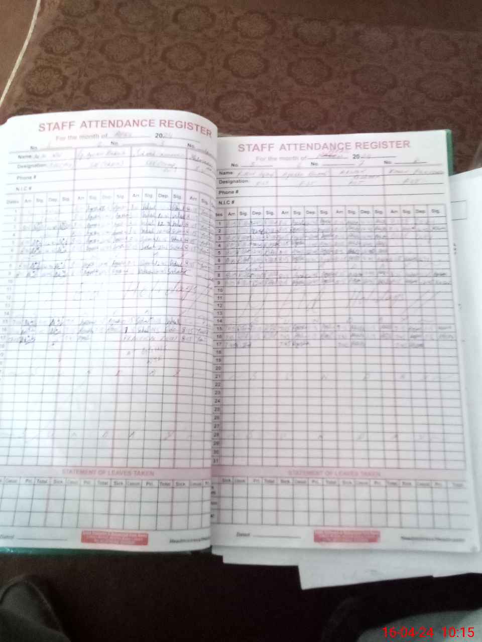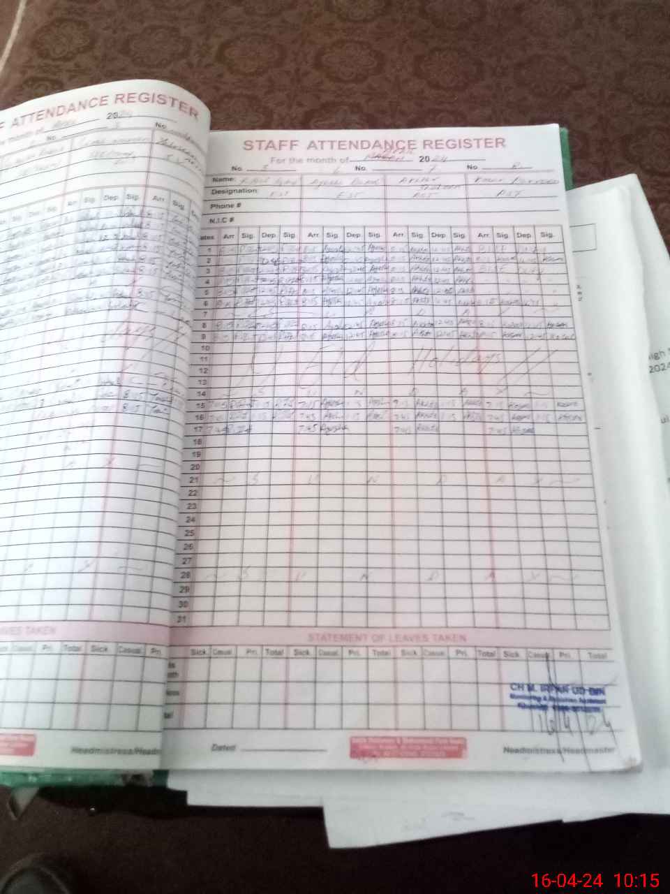 | CNIC | Full Name | Designation | R/C | Absence During Last Calender Month |