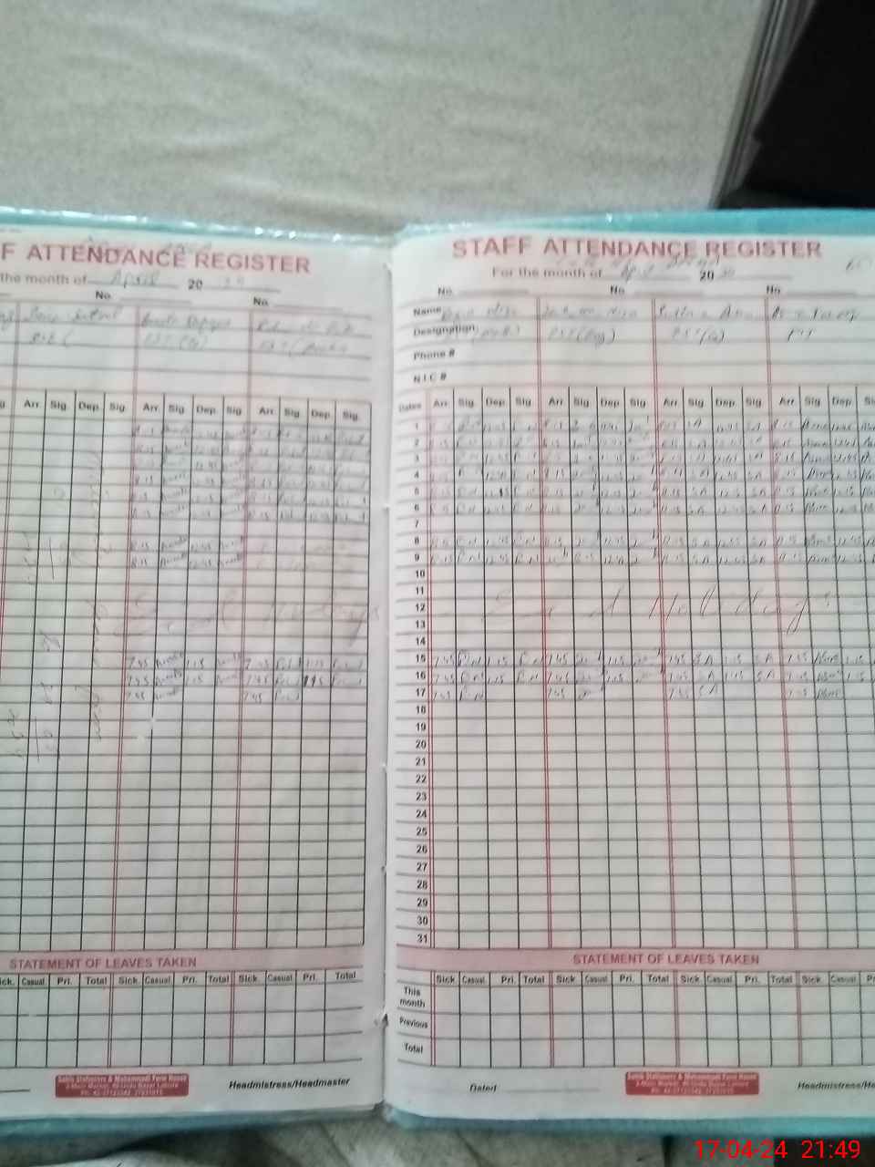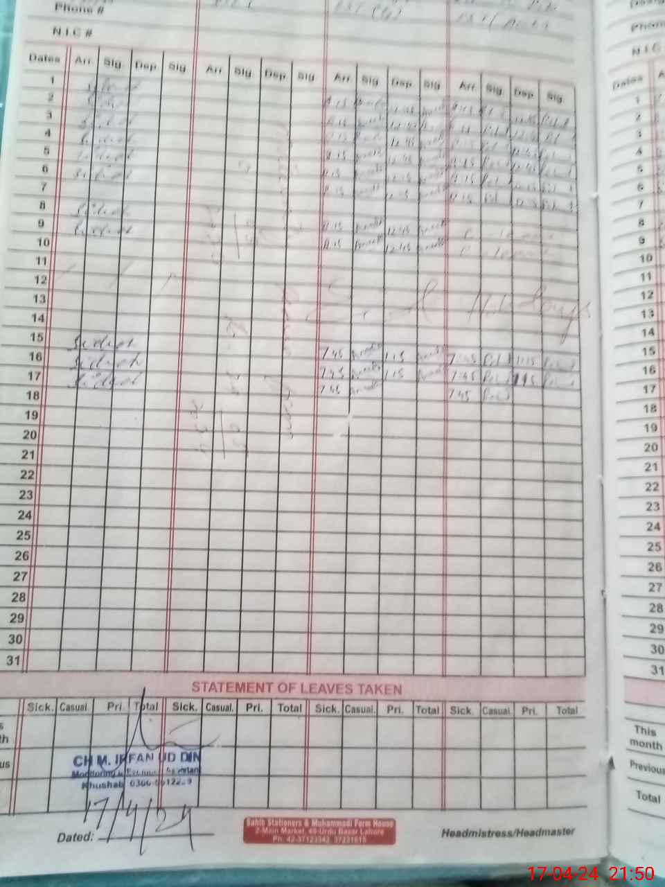 | CNIC | Full Name | Designation | R/C | Absence During Last Calender Month |