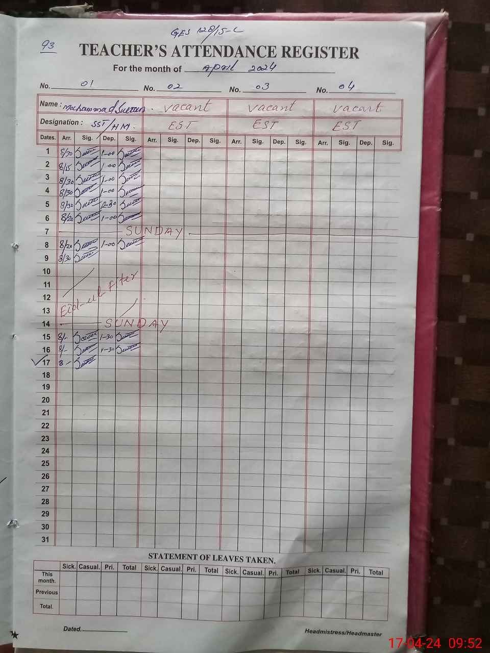 | Name: Mu**** Su**** Designation: (School Headmaster's/Headmistress's) SST Phone/Cell Number: 03**** |