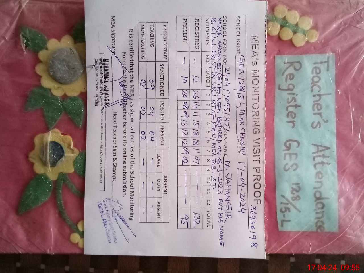 | Attendance Register | Head Teacher | MEA with School | Visit Proof |