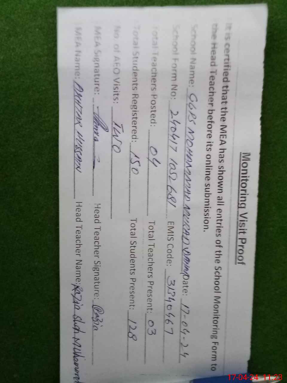 | Attendance Register | Head Teacher | MEA with School | Visit Proof |