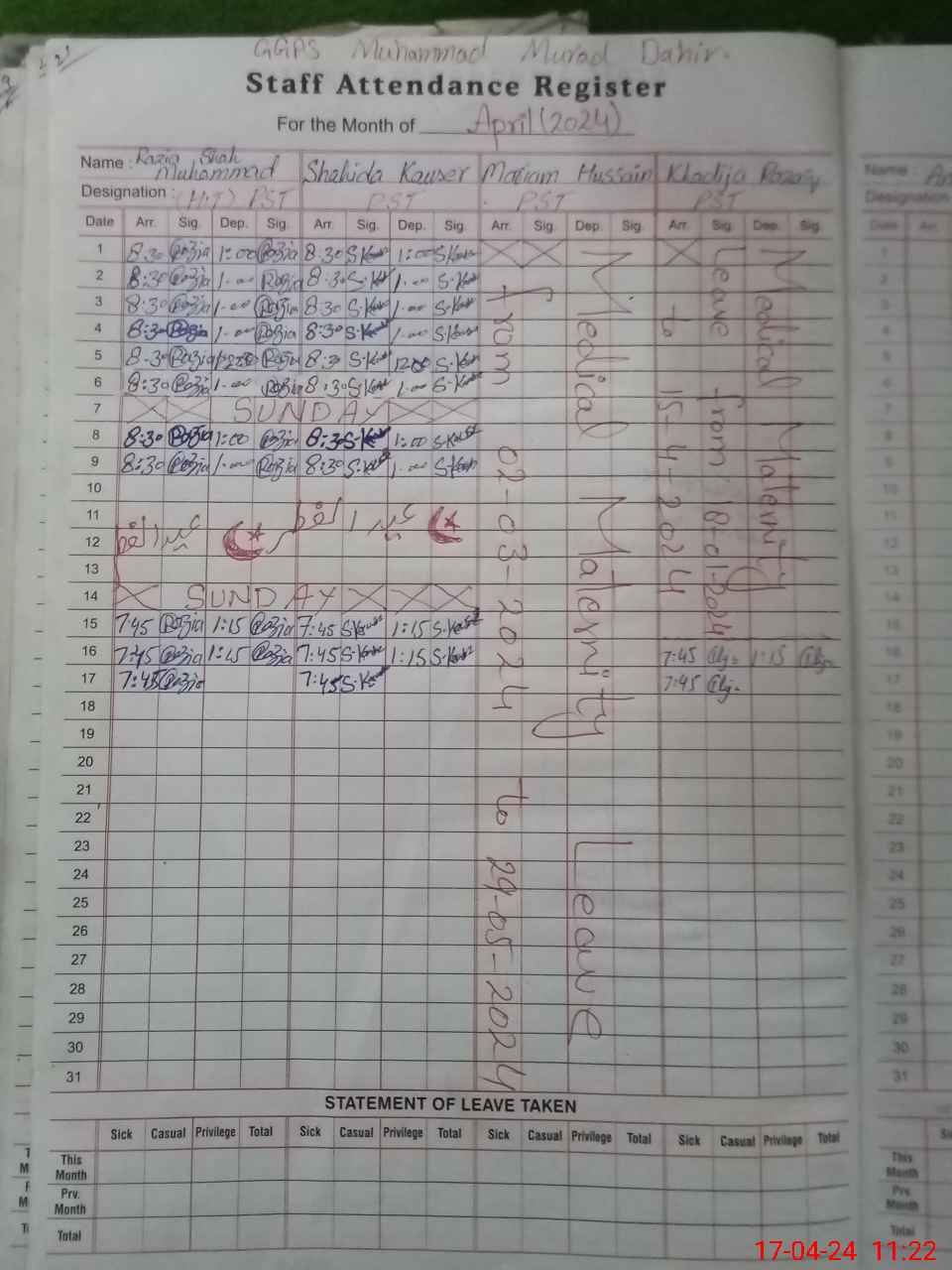 | 31**** | Ma**** Hu**** | PST | Regular | 31 | 0 | 0 | 31 | 0 | 0 | 0 | 0 | 0 | Maternity |