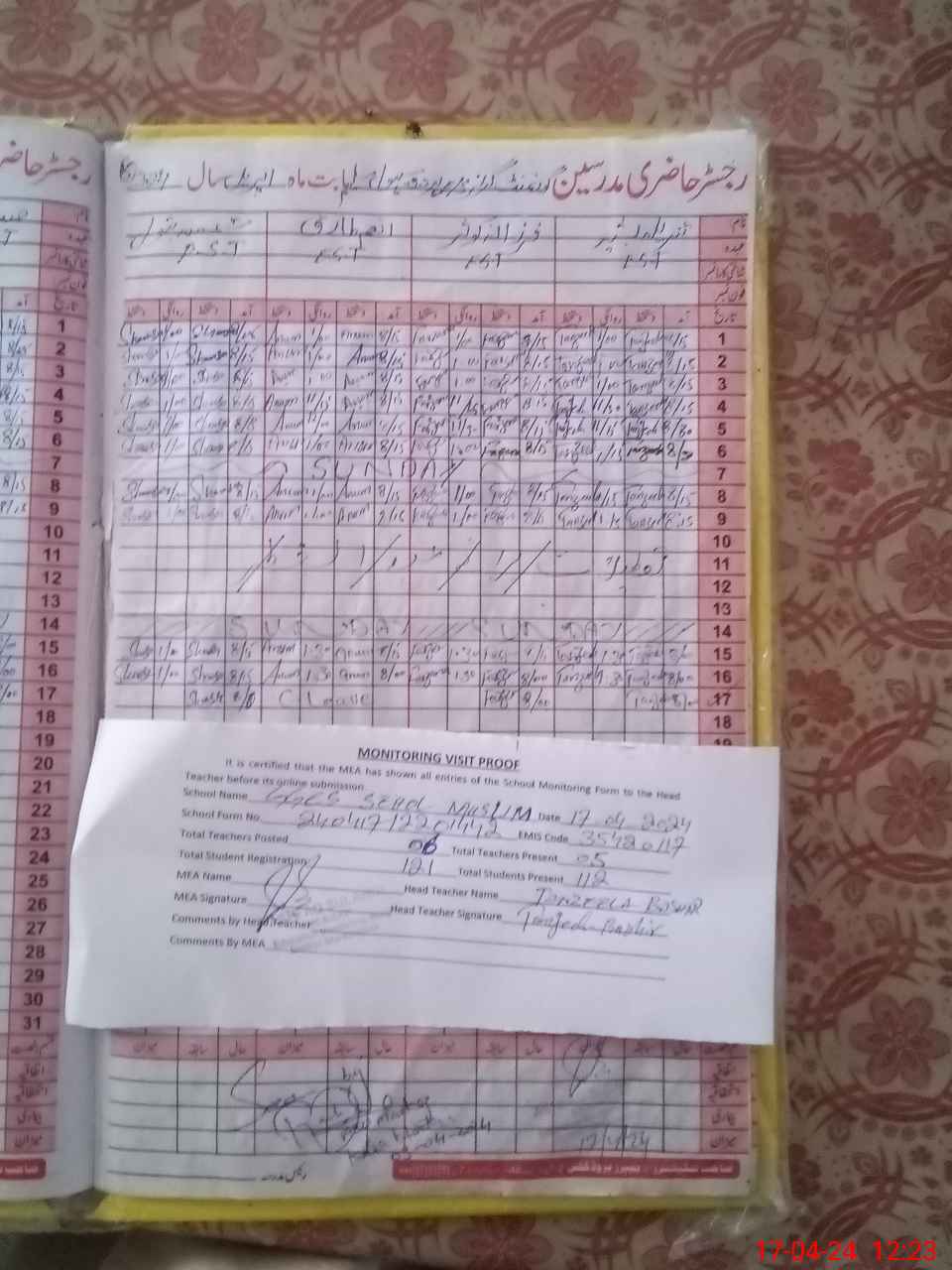| Attendance Register | Head Teacher | MEA with School | Visit Proof |