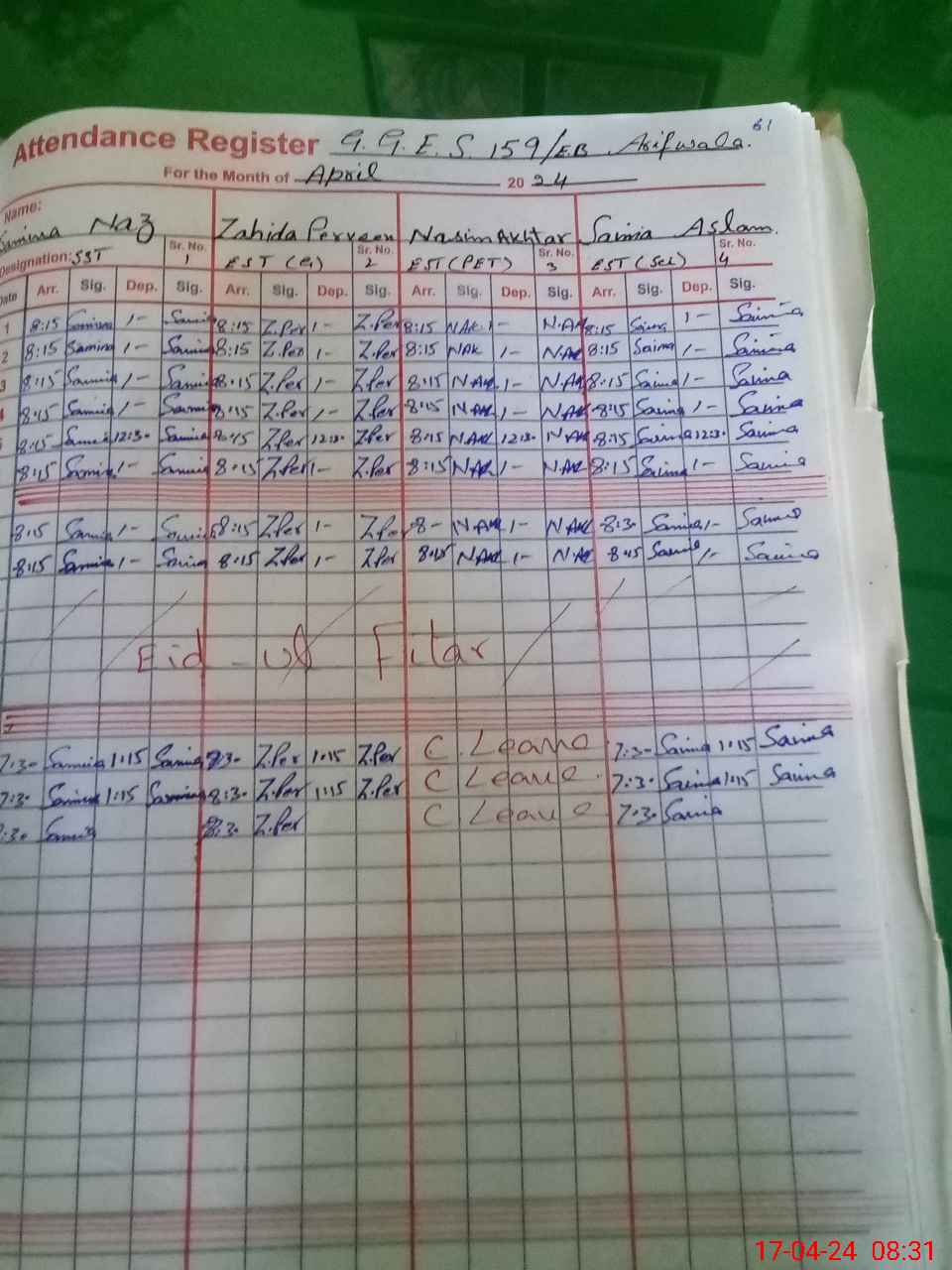 | CNIC | Full Name | Designation | R/C | Absence During Last Calender Month |