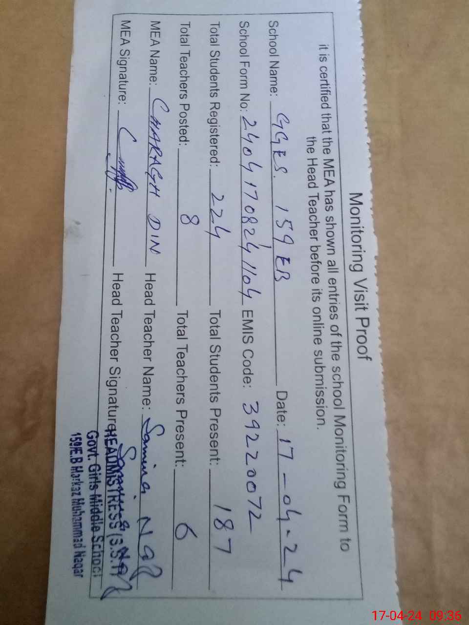 | Attendance Register | Head Teacher | MEA with School | Visit Proof |